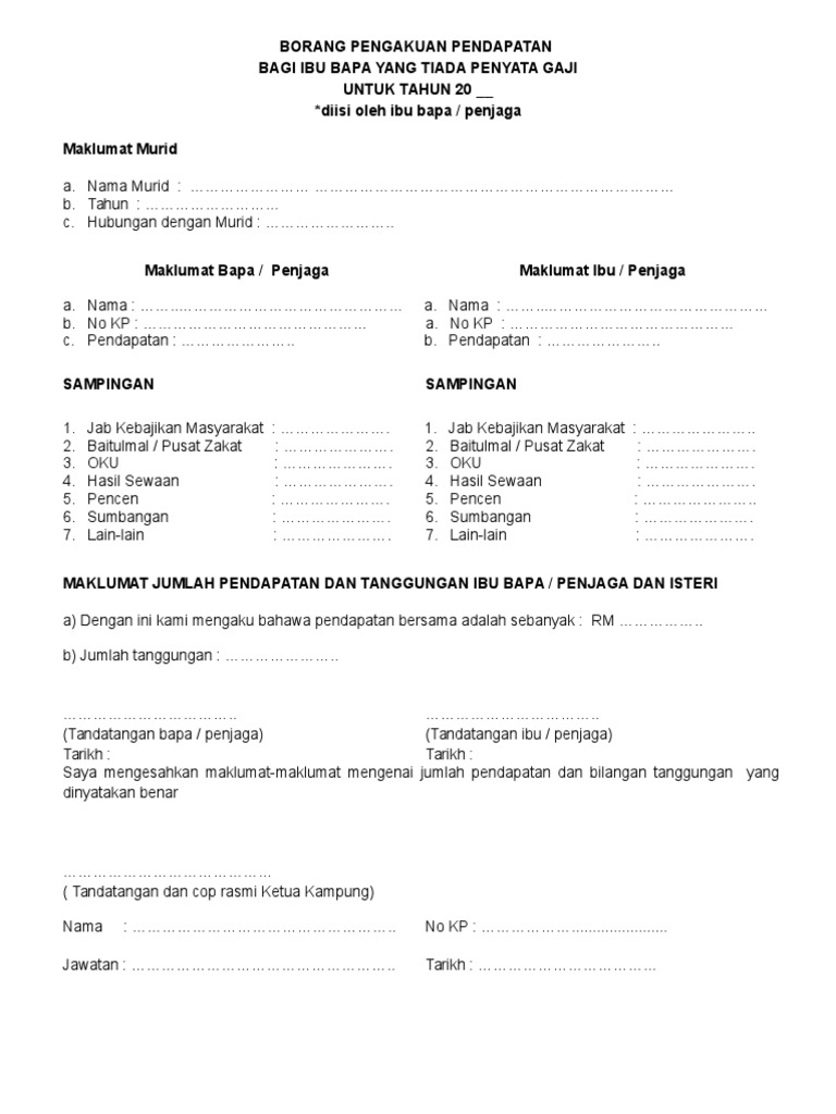 Related : Borang Pengakuan Pendapatan Bagi Ibu Bapa Yang Tiada Penyata Gaji - Saya dengan ini mengesahkan bahawa pendapatan yang dinyatakan di atas adalah munasabah dan benar, berdasarkan pengetahuan saya..