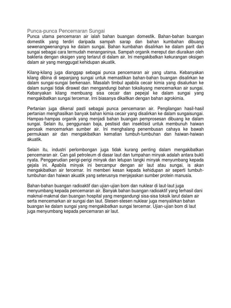 Daripada sumber yang kami dapati antara puncanya ialah; Punca pencemaran air online worksheet for ppki. Pssas kssrpk tahun 4 grade/level: Terdahulu, air selangor memaklumkan loji rawatan air sungai selangor fasa 1, fasa 2, fasa 3 dan rantau panjang dihenti tugas awal pagi tadi, susulan pencemaran bau yang dikesan di sungai selangor. Air juga mempunyai peranan yang penting di dala kehidupan manusia.