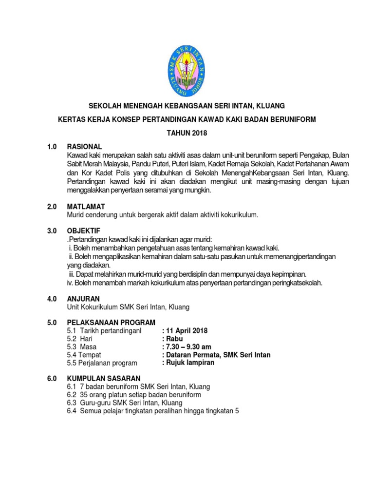 Objektif lawatan penanda aras ini dibuat adalah ; Gimik hari guru 2019 smk (p) kapar. Buku pengurusan 2020 smk seri intan kluang. Pengenalan sekolah agama seri intan guru besar : Semua pelajar dikehendaki berpakaian sukan.
